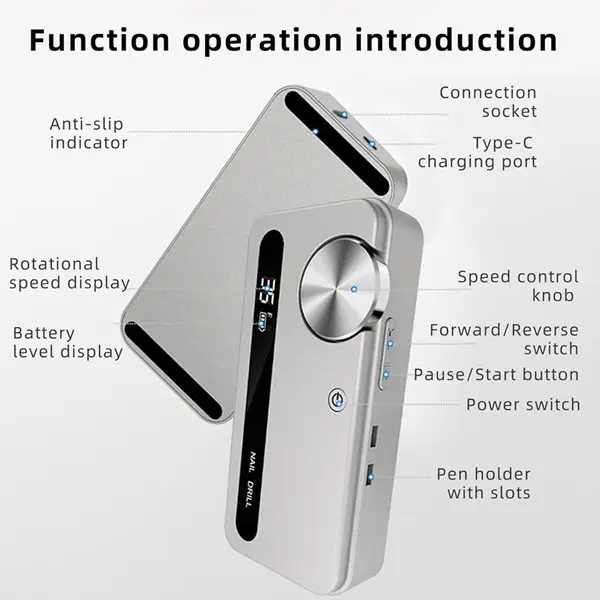 Powered by a 4000mAh rechargeable battery, this professional electric nail file delivers up to 7 hours of working time, allowing you to perform nail treatments anywhere. Its low-noise and low-vibration motor ensures a comfortable experience, while the 45-speed adjustable control provides precise operation for beginners and professionals.