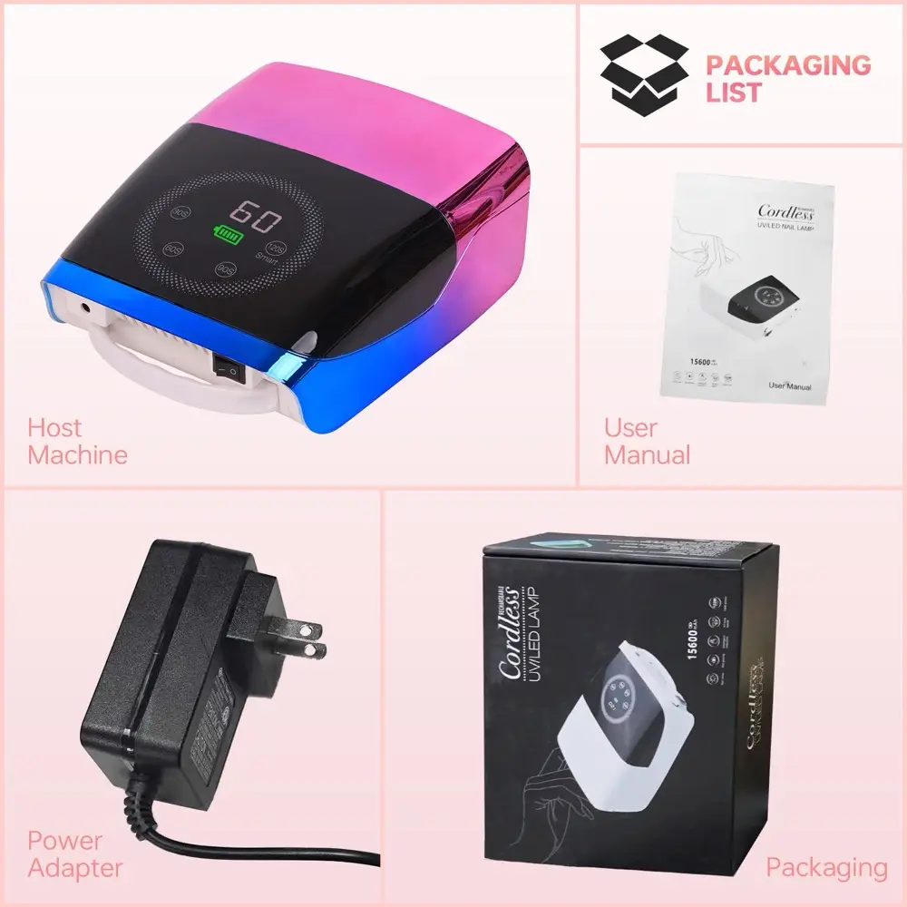 Portable rechargeable gel nail dryer with 132W power & 44 dual-wavelength LED beads. Features intelligent sensor, 15600mAh battery (12h runtime), 4 timer settings, and HD touch display. Fast, salon-quality curing anywhere. CE/ROHS certified.