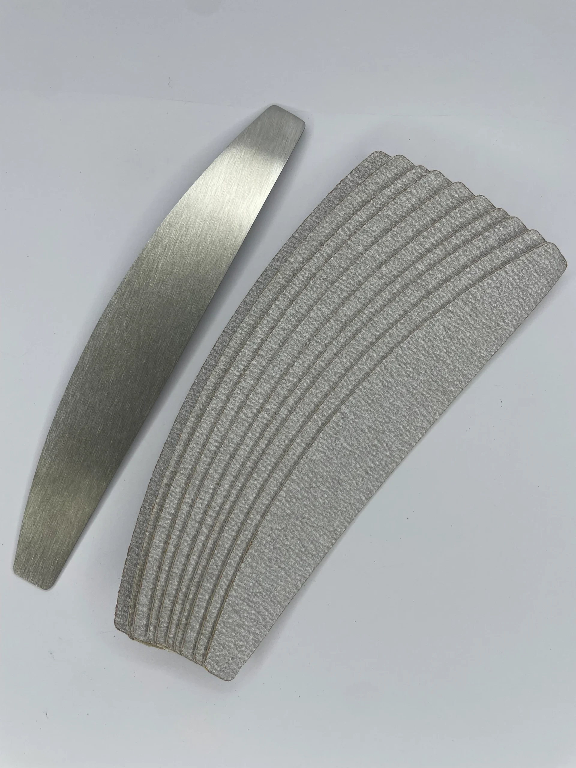 Our Metal Nail File Core & Replacement Self Adhesive Nail File Refills provides a durable, reusable base for consistent nail filing performance, retaining its shape and stability over time. Paired with **Self-Adhesive Nail File Refills**, this setup allows for easy pad swaps to meet various needs while ensuring hygiene and efficiency. The metal core is designed for effortless disinfection and reuse, offering an ergonomic, eco-friendly solution. Ideal for professional salons focused on both sustainability and convenience, the core is reusable, while the disposable, self-adhesive refills allow for quick changes between clients. Available in 100, 120,150, 180, 240 grits, and a 100/180 buffer, these refills provide a range of options to suit different filing preferences.