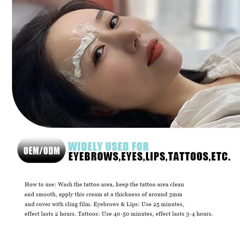 Professional numbing cream for pain-free microblading, tattoos, and piercings. Fast-acting (5-10 mins), 2-hour relief. Safe, gentle, dermatologist-tested.