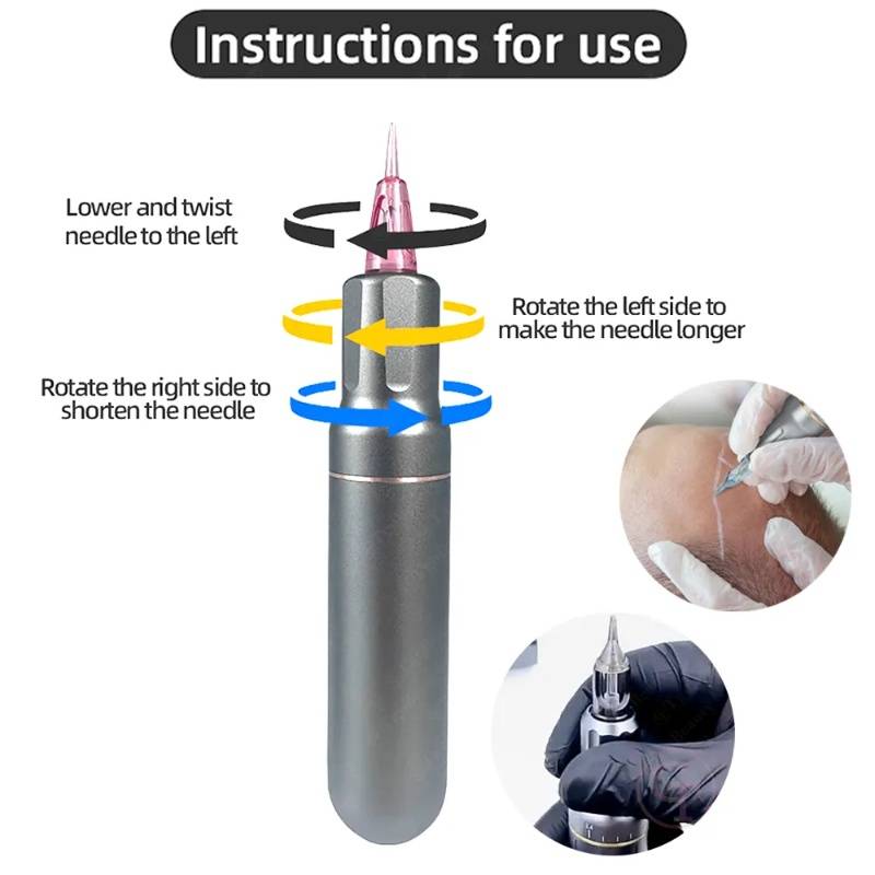 Rotate left to extend needle length | Twist right to shorten | Secure lower lock for perfect depth control in scalp tattoo procedures.